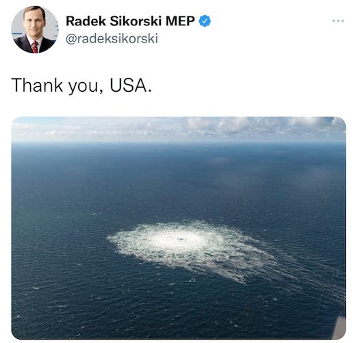 That was evidently the view of Radek Sikorski, the former foreign and defence minister of Poland, who tweeted a “Thank you, USA” with an image of the bubbling seas where one pipeline was ruptured.