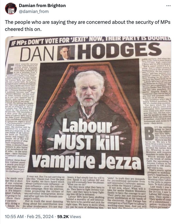 Why? The question hardly needs answering. Because it was the establishment political and media class doing the smearing and inciting. It was the same people whining now about their safety who were actively endangering elected representatives like Corbyn.