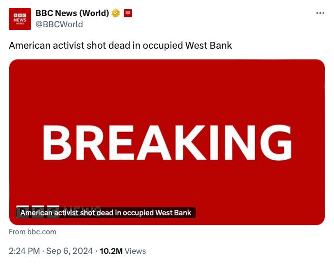 We are talking about the same “anti-Israel” BBC that just ran yet another headline – this time after an Israeli sniper shot an American citizen in the head – that managed somehow, once again, to fail to mention who killed her. Any casual reader risked inferring from the headline “American activist shot dead in occupied West Bank” that the culprit was a Palestinian gunman.