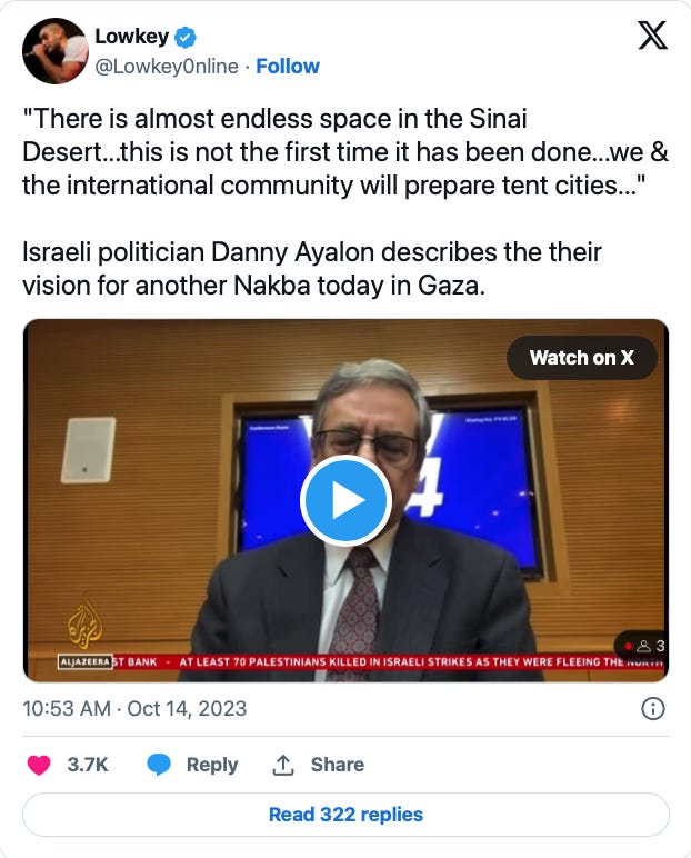 The next day, a former Israeli ambassador to the US, Danny Ayalon, a Netanyahu confidant, amplified the point: "There is almost endless space in the Sinai Desert… This is not the first time it has been done… We and the international community will prepare the infrastructure for tent cities."