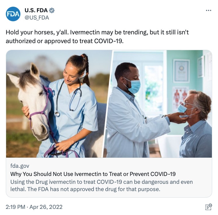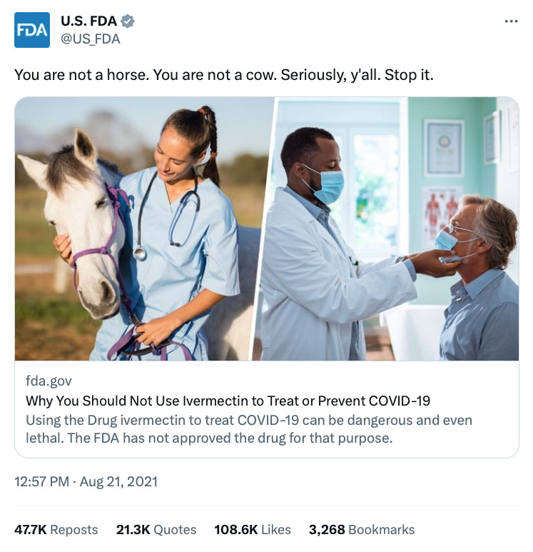 After all, the general assumption that Ivermectin is a horse dewormer didn’t come from nowhere. It was a view cultivated in us by the FDA and the corporate media. Here is the tweet the agency sent out exactly two years ago to persuade us that only dangerous nutjobs talk about Ivermectin:
