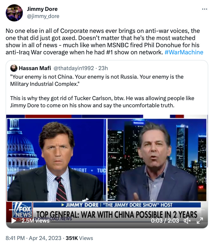 As Dore tweeted after Carlson’s sacking: “No one else in all of corporate news ever brings on anti-war voices, [and] the one that did just got axed. Doesn’t matter that he’s the most watched show in all of news – much like when MSNBC fired Phil Donohue for his anti-Iraq War coverage when he had #1 show on network.”